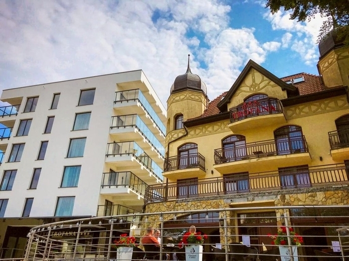 Ausstattung: gepflegtes Hotel bestehend aus 2 Gebäudekomplexen, Restaurant, Café, Lift, Kosmetiksalon, WLAN (kostenfrei), Bademantelservice (gegen Gebühr), modernes Behandlungszentrum mit Möglichkeiten für medizinische Massagen (klassische Teilkörpermassage, Reflexzonenmassage), Bewegungstherapie (Gruppenheilgymnastik im Trockenen und im Wasser, Nordic Walking) Elektrotherapie (Diadynamik, Magnetotherapie), Wärmetherapie (Thermopackung, Moorpackung), Lichttherapie (Lasertherapie, Sollux, Bioptron), Inhalationen.