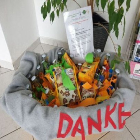 Frau Förster überreichte uns im Namen vom Schulleiter Herrn Binder und der Hortleiterin Frau Worm eine liebevoll dekorierte Wanne voller Leckereien – Saft und Süßes, verziert mit selbst gebastelten Anhängern der Schüler.